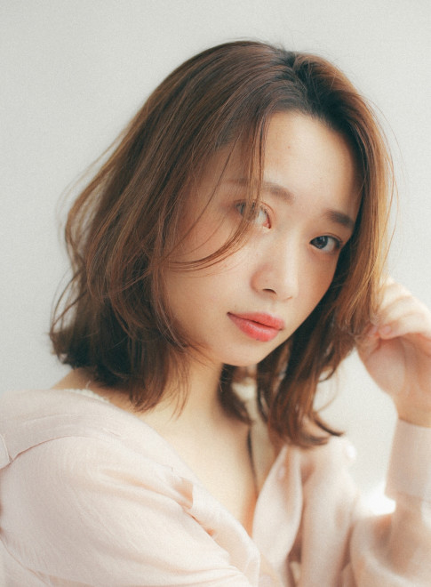 表面をふわっとさせることで全体のバランスを整え、面長が気になる方でも楽しめる髪型に完成。切りっぱなしと相性の良い外ハネにスタイリングすることで、一気にトレンド感がアップします。