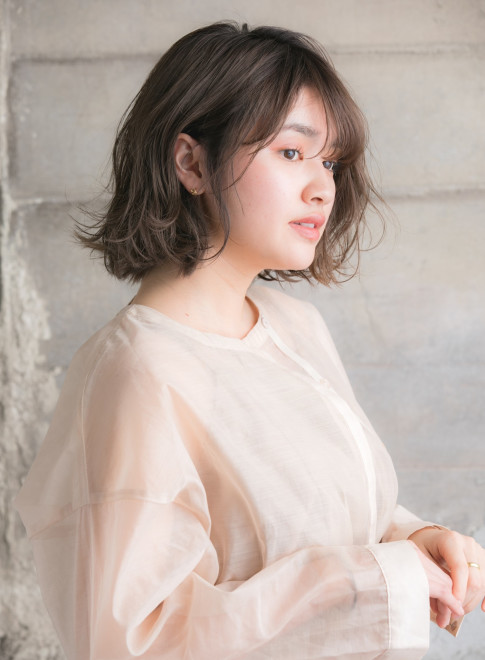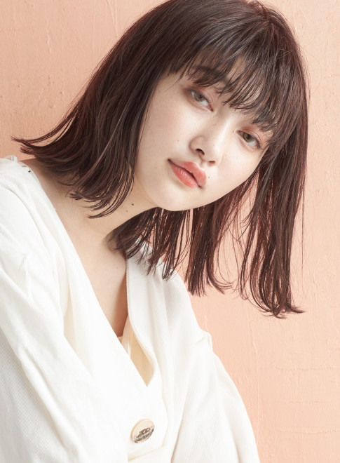 人気のロブスタイルを外ハネにし、ラフでトレンド感たっぷりに。前髪は眉毛が見え隠れする絶妙な長さに設定することで、一気にあか抜け顔に変身。暗い髪色でもおしゃれに決まります。