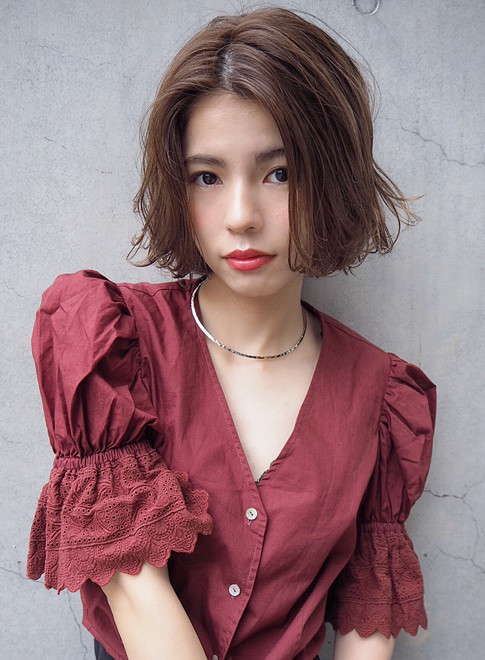 顎ラインで切りっぱなしにした人気のスタイル。トップにレイヤーを入れることで軽い印象にし、全体にパーマをかけてふわっとした動きを演出。女性らしい柔らかな雰囲気に仕上がります。