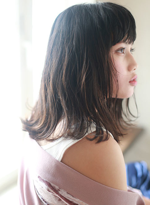 ちょっぴり長めの鎖骨レングスで平行にカットすることで、女性らしく色っぽい切りっぱなしスタイルに。表面にレイヤーを入れているのでふわっとした動きが出やくすく、髪がペタッとしがちな方にもおすすめです。