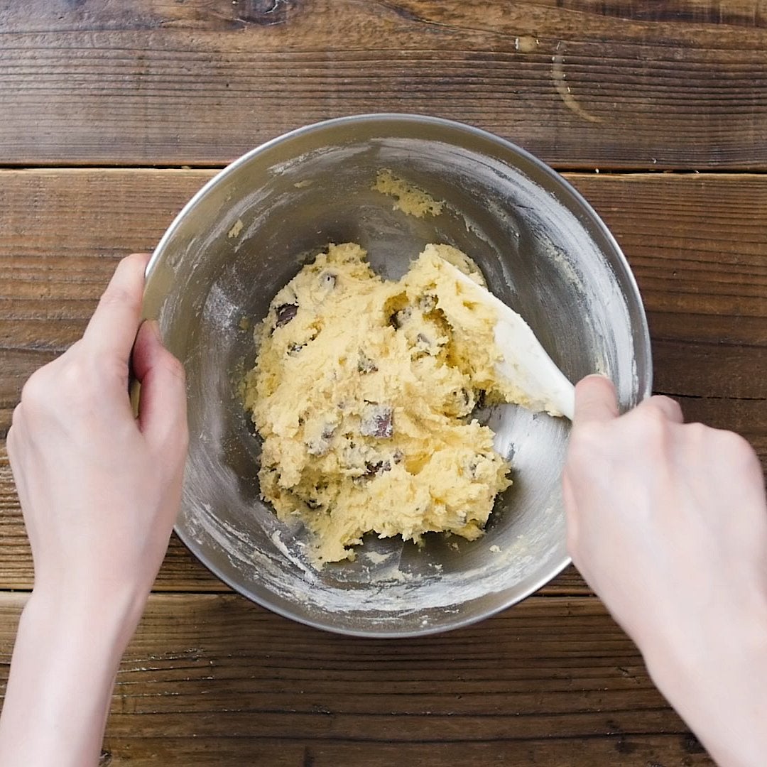 ホットケーキミックス、ミルクチョコレートを加えてゴムベラでさっくり混ぜます。