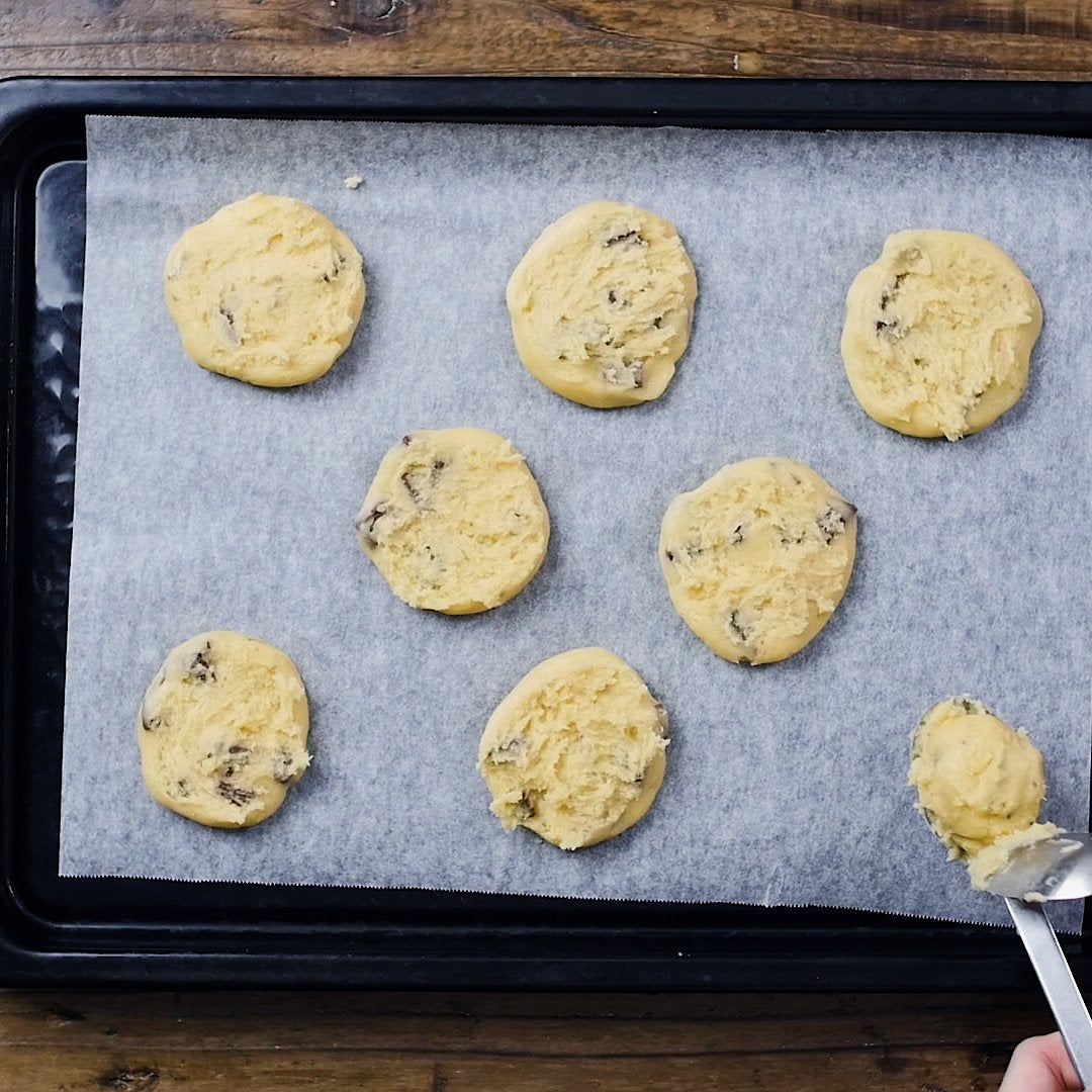 クッキングシートを敷いた天板の上にスプーンで落とします。※広がるので間隔をあけてください。