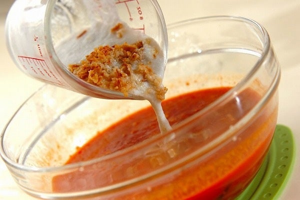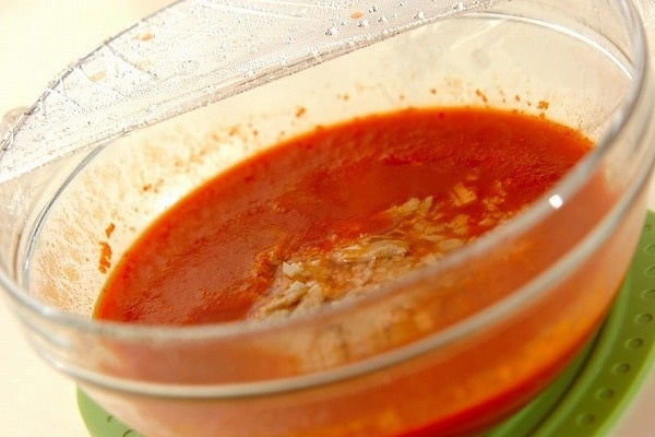 3、耐熱ボウルにツナ、ミックスビーンズ、ニンニク、野菜ジュースを入れ、ラップをかけて電子レンジで5分加熱する。