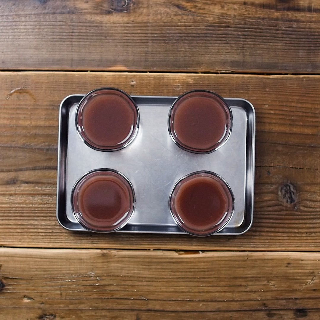 粗熱が取れたら容器に流し入れ、冷蔵庫で冷やし固めます。金箔をのせたら完成です。