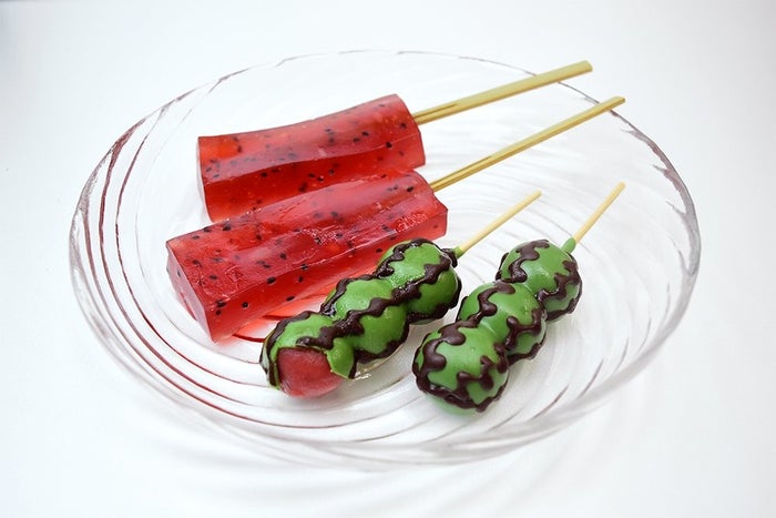 チョコマントすいか(すいか団子)は、すいか果汁をたっぷりと使用した赤いお団子にすいかの皮を模したチョコレートをコーティング。その姿はまるで小玉すいかのようです。見た目も涼しげな夏スイーツを味わおう
