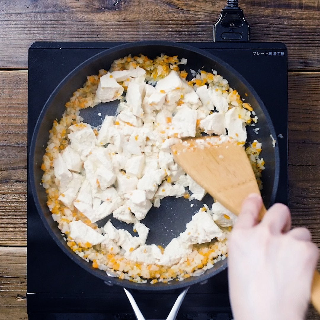 豆腐を加えて崩しながら炒め、水分を飛ばします。