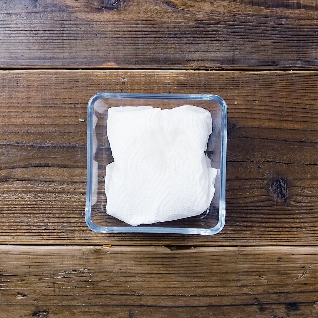 木綿豆腐をキッチンペーパーで包み、レンジ600Wで2分加熱します。取り出したらキッチンペーパーを取り替え、重しをのせて15分ほどおき、水切りをします。