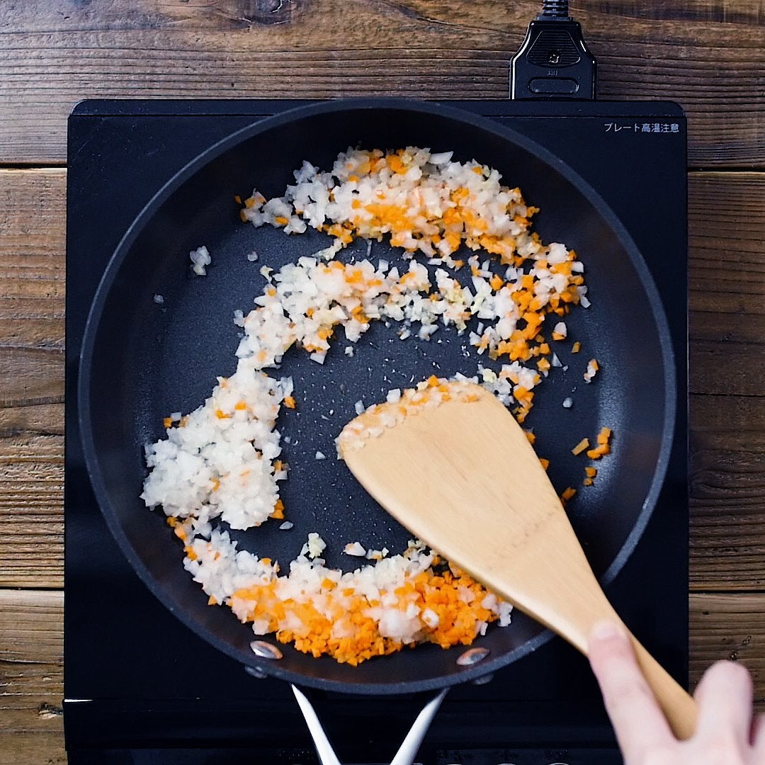 フライパンにサラダ油を熱し、しょうが、玉ねぎ、にんじんを加えて炒めます。