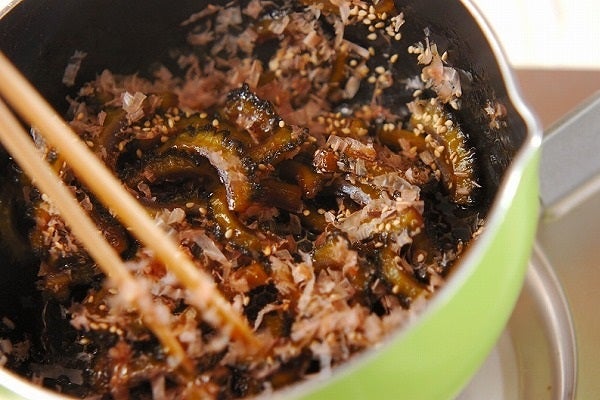 「醤油」や「砂糖」に疲労回復に一役買う「お酢」を加えて煮た佃煮に、鰹節をたっぷり加えます。鰹節の持つ「イノシン酸」とゴーヤを合わせることで、独特の苦味を旨味に変えてくれるのです。白いご飯はもちろん、冷やしうどんやお豆腐に乗せても◎。