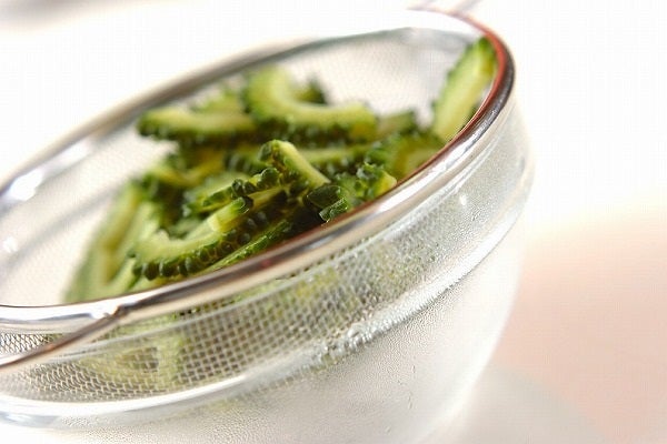 1、ゴーヤは縦半分に切って、スプーンで種とワタを取り除く。幅7~8mmの半月切りにして熱湯でゆで、ザルに上げて水気をきる。