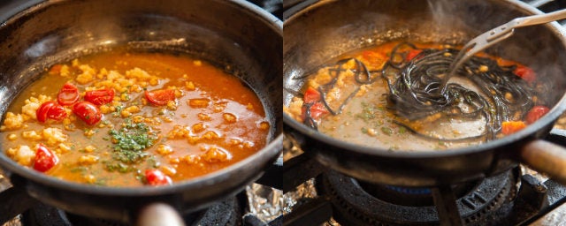 ちなみに今回の前菜やイカスミのパスタには、さっぱりとした味わいの白ワイン「ファレリオ」(写真上・左)。タィアリンのパスタには、ほどよい果実味と酸味がポルチーニ茸とマッチする赤ワイン「バルベーラ・ダスティ」(同・右)がおすすめだそう。