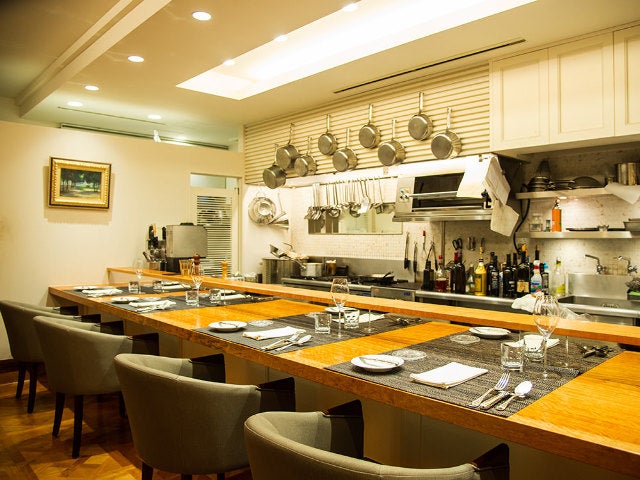 ゆったりしたチェアに腰掛ければ、シェフが食材を切る音や、華麗な鍋の動きやソースの香りが五感を刺激し、料理への期待を高めてくれる。
