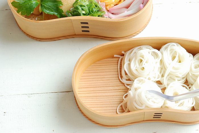 今回は2段のお弁当箱を使い、上段にそうめん、下段に稲荷ずしとそうめんのトッピングを詰めました。