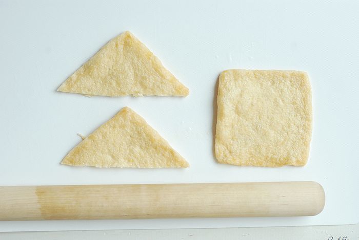 ② 揚げをめん棒で軽く伸ばし、2等分にカットして中を開きます