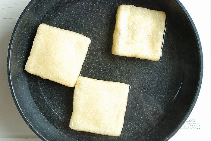 ① フライパンに湯を沸かし、揚げをさっと湯通ししてザルに上げます