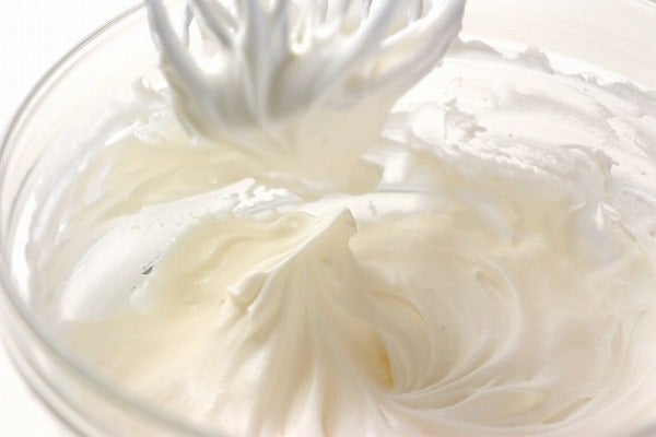 2、<ホイップクリーム>を作る。ボウルに生クリーム、砂糖を入れボウルの底を氷水で冷やしながら、泡立て器で角が立つくらいまで泡立て、絞り袋に入れる。(すぐに使わない場合は冷蔵庫に入れておく)