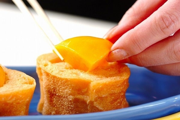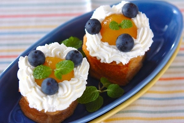 3、器又はアルミケースにフランスパンを入れ、食べやすい大きさに切った桃をのせて、<ホイップクリーム>を絞り出し、ブルーベリーを散らせ、ミントの葉を添える。