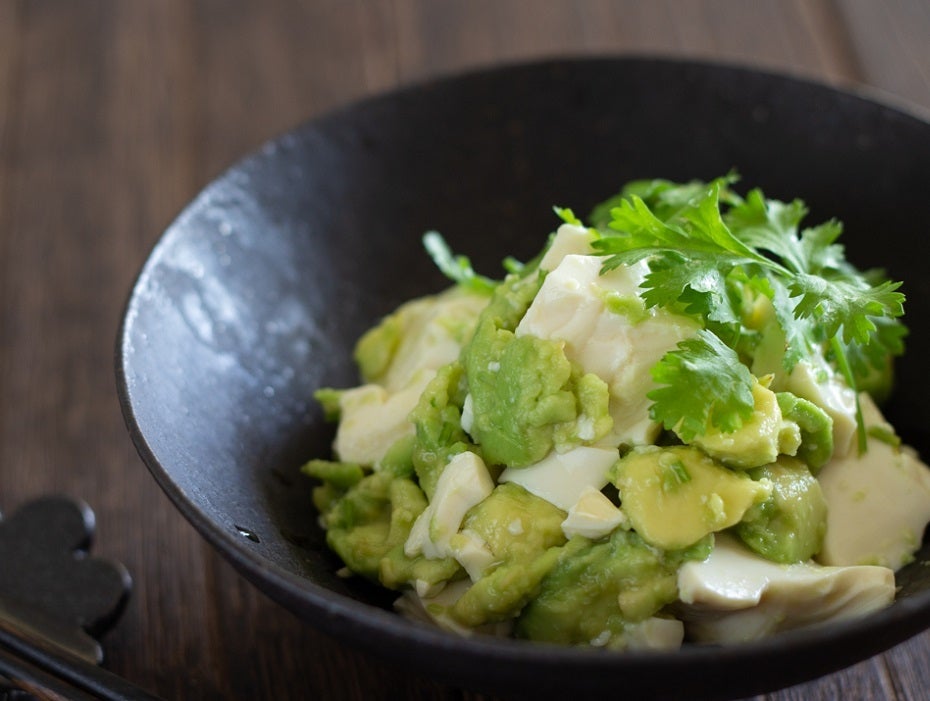 豆腐とアボカドを混ぜたくずし冷奴は、ごま油と塩で味付けします。
