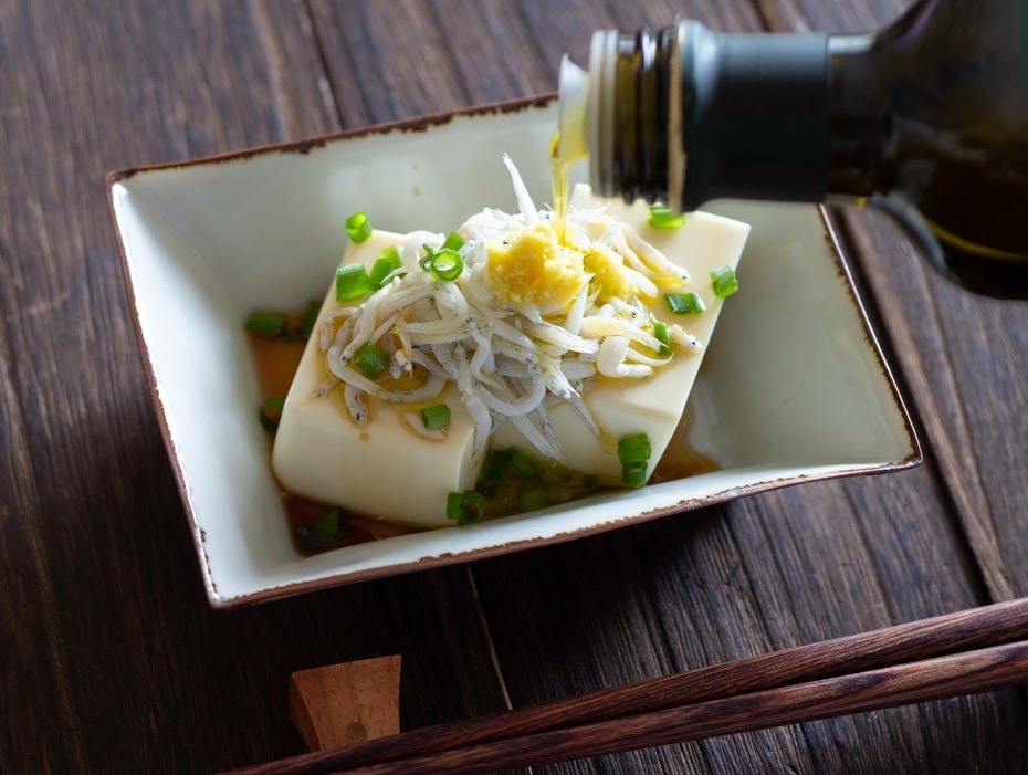 栄養豊富なしらすに生姜をのせて、たれは醤油にオリーブオイル。オリーブオイルの風味が、豆腐やしらす、生姜と相性もよくて、意外なおいしさです。