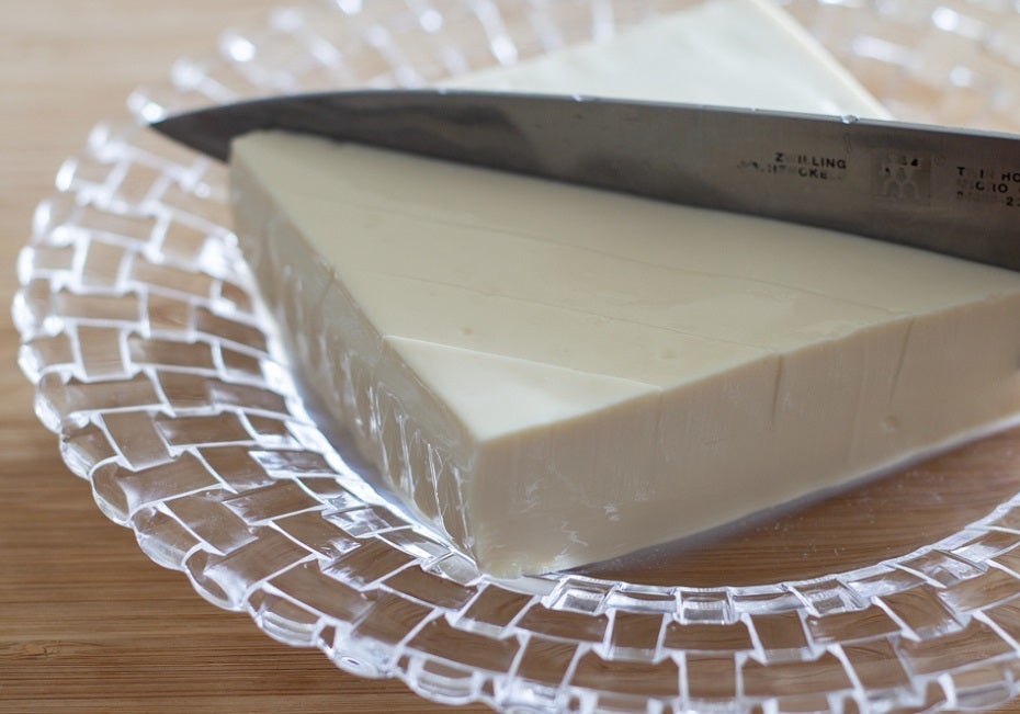 ③ 豆腐はそのまま皿に盛り、1.5cm位の間隔で幅に切り込みを入れる。(豆腐の半分の深さまで)豆腐を少し倒して縞模様にする。
