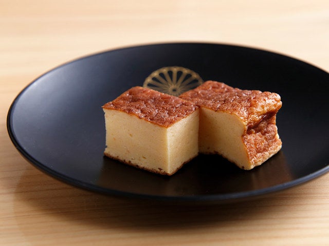 焼きあがったら紙とラップフィルムで包んで寝かせることで、気泡が落ち着いてこのような食感になるそうだ。固めのプリンのように口当たりがよく、こんがりとした焼き目もいい具合だ。