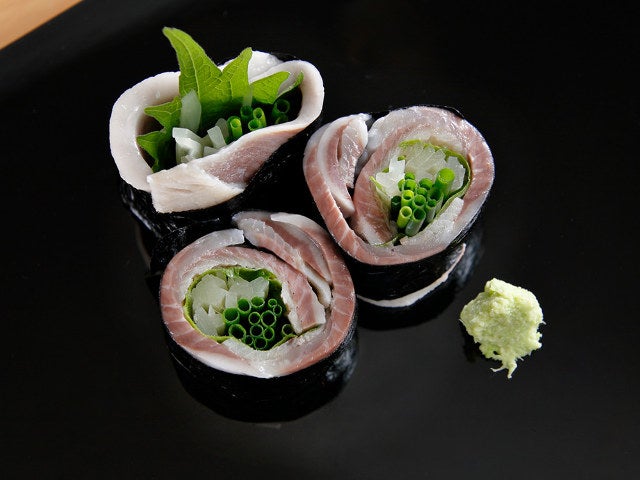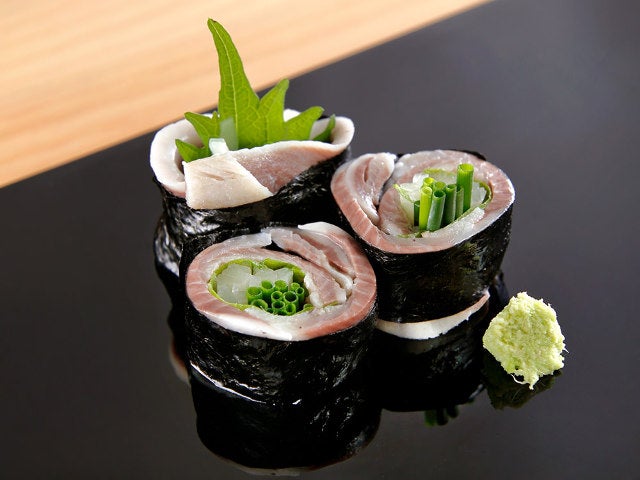 しっかり酢締めした旬の光り物(今回は岸和田産の鰯を使用)に、ネギ・ガリ・紫蘇などの薬味をのせ、海苔で巻いたもの。