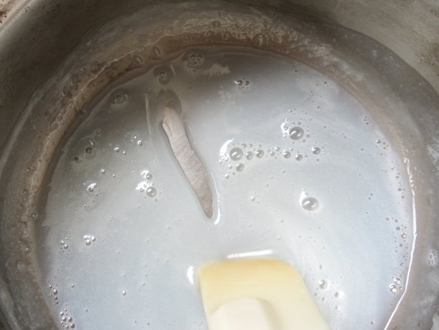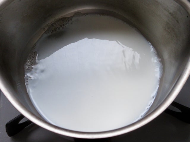 ② 焦がさないようにヘラで混ぜながら、ゆっくり煮詰めていきます。真っ白だった牛乳に少し透明感が出てきます。鍋底にヘラで線がかけるようになるまで、煮詰めればできあがり。清潔な保存容器に入れ、冷蔵庫でよく冷やしておきます。