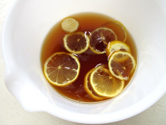 ⑤ ボウルに、きび砂糖、レモンのスライスを入れ、④を熱いうちに入れ、砂糖をよく溶かします。最後にレモン汁を入れてできあがり。清潔な保存容器に入れ、冷蔵庫でよく冷やしておきます。