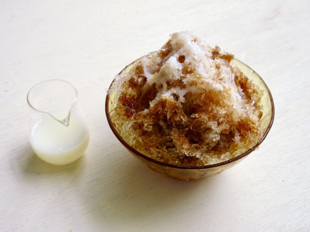 ④ かき氷に、③のコーヒーシロップ、②の練乳をたっぷりかけて、召し上がれ。