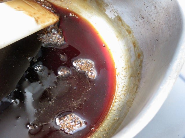 ③ コーヒーシロップを作ります。小鍋に、濃いめにいれたコーヒー、きび砂糖を入れ、中火にかけます。焦がさないように注意しながら、とろみが出てくるまで軽く煮詰めます。粗熱がとれたら、好みでウイスキーをほんのちょっと入れます。清潔な保存容器に入れ、冷蔵庫でよく冷やしておきます。