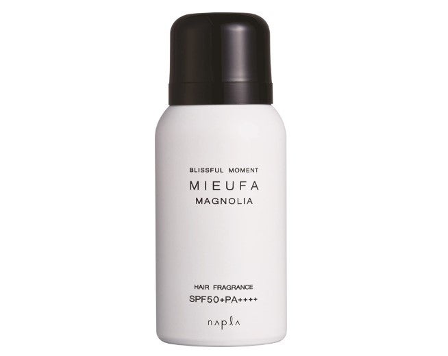 スプレータイプのナプラ ミーファ フレグランスUVスプレー マグノリア 。お出かけ前に髪にスプレーするだけで、紫外線から髪を守ってくれます。オレンジやジャスミン、マグノリアなどの香りも楽しめるヘアフレグランスとしての役割もあります。
