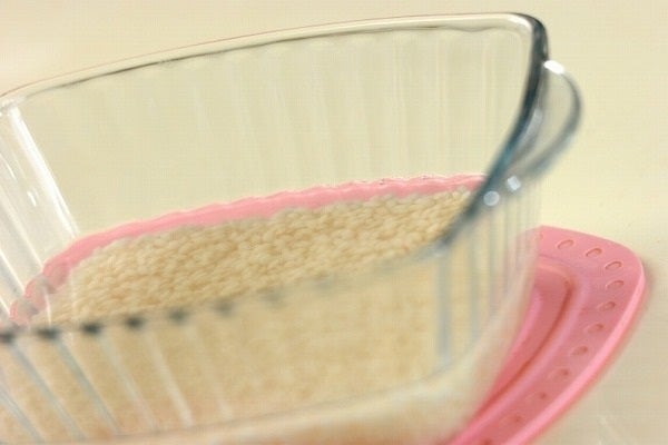 ・もち米は水洗いしザルに15分上げてから、耐熱の密閉容器に水と一緒に入れ、15~30分置く。