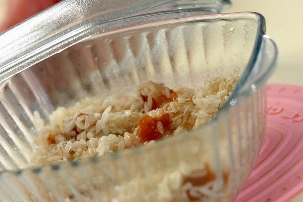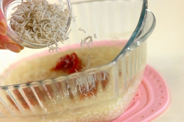 1、昆布茶と酒を加えて軽く混ぜたら、梅干しとチリメンジャコを上にのせる。蓋をきっちり閉めないように軽くのせ、電子レンジで6分加熱する。