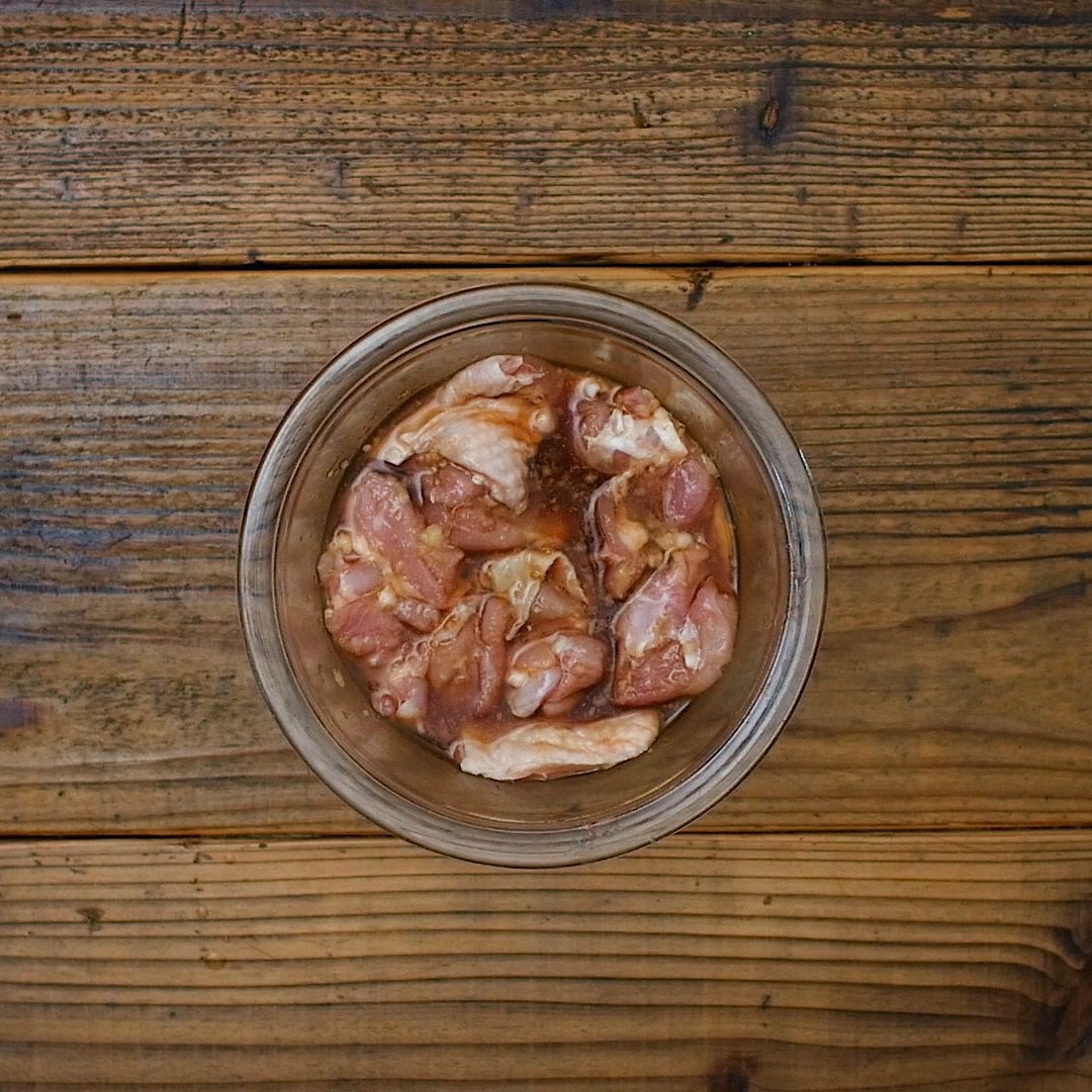 ボウルに鶏肉、(a) の調味料を入れて混ぜ合わせて、15分漬け込みます。