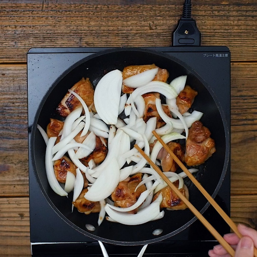 ・鶏もも肉 … 1枚(300g)・玉ねぎ … 1/2個・a. 砂糖 … 小さじ1杯・a. 酒 … 大さじ2杯・a. しょうゆ … 大さじ2杯・a. みりん … 大さじ2杯・a. しょうが(すりおろし) … 大さじ1杯・サラダ油 … 小さじ1杯トッピング・キャベツ … 適量【下ごしらえ】鶏もも生姜焼き