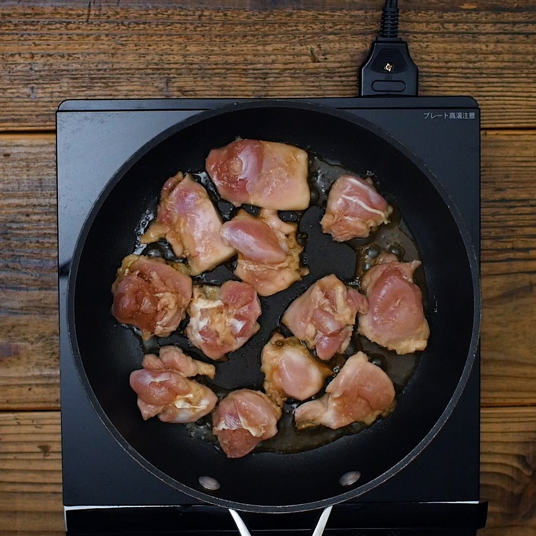 フライパンにサラダ油を引き中火で熱し、鶏肉を皮目から入れて焼きます。この時調味液は残しておきます。