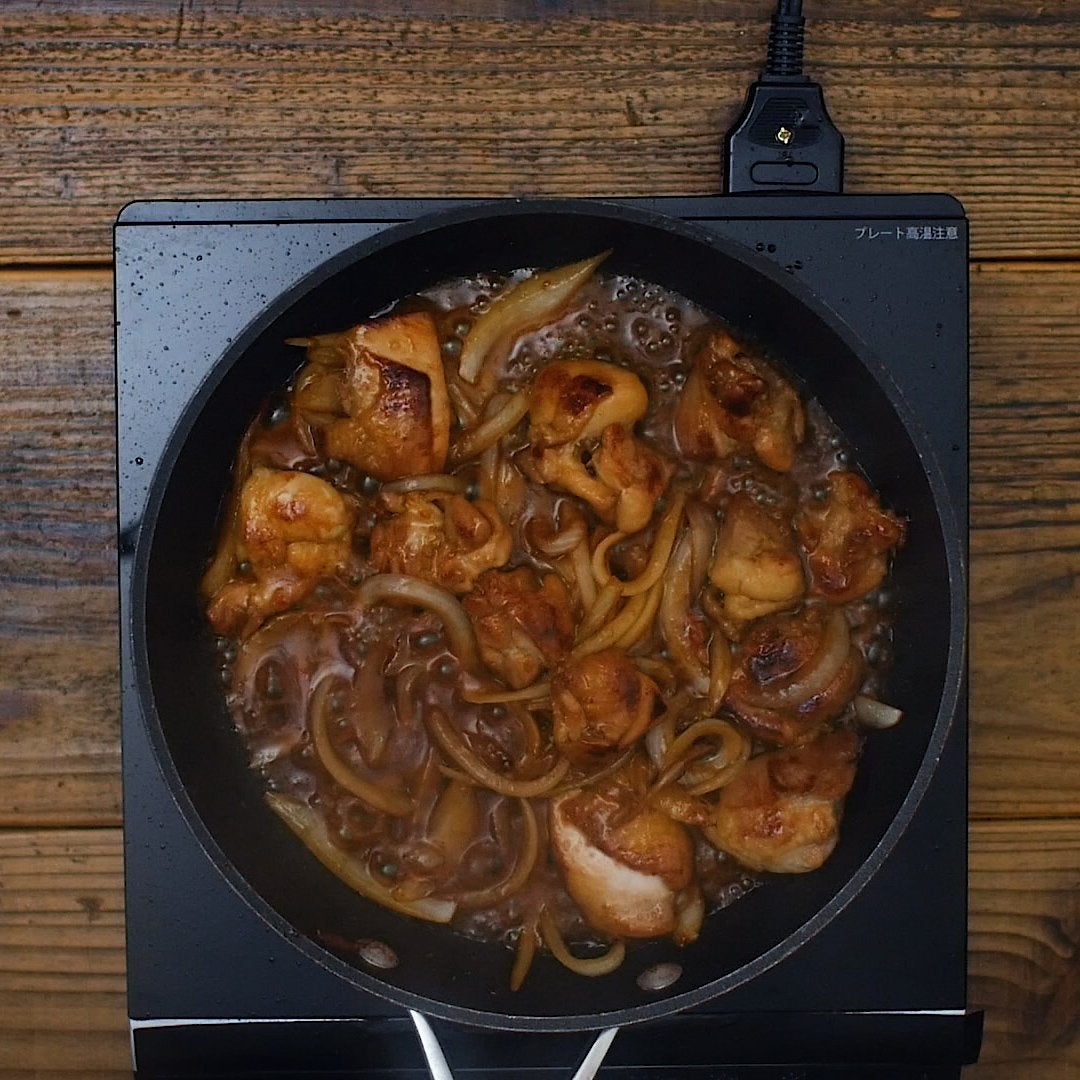 鶏肉に火が通ったら残しておいた調味液を加えて煮絡めます。