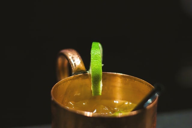 一般的な作り方をしたモスコミュールの場合、10〜15%ほどの度数におさまることが多いようです。ベースのウォッカの平均度数が40%なので、だいぶ飲みやすい度数になっていると言えますね。そのうえ、ライムを絞れば爽やかさが増しますので、たとえ度数が15%のモスコミュールだとしても、美味しく飲めてしまうでしょう。