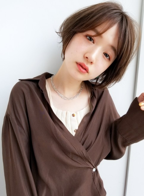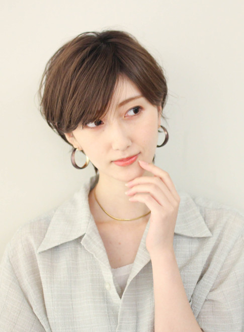 丸みとくびれのあるシルエットが美しく、ショートでも女性らしい印象に。襟足はすっきりさせているのでメリハリが生まれ、暑い日も邪魔になりません。前髪は長めに流し、大人っぽく仕上げます。
