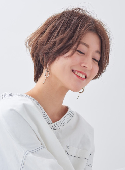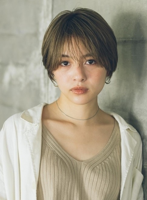 ナチュラルで気取らない雰囲気が今っぽいショートスタイル。ボリューム感をなくして軽さと束感を出し、自然な質感に仕上げます。ラテカラーをベースにしてハイライトをプラスすることで、夏らしい色合いに完成。