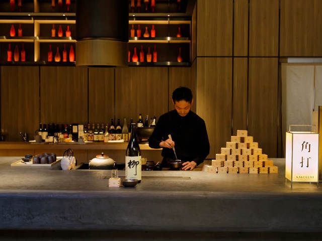 銀座の新しい粋なスタイルは「ホテルで角打ち」 入口正面には、漆喰塗りのカウンターが鎮座。ここは17時より角打ちが楽しめる場所だ。