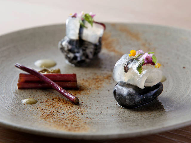 こちらは4月のコース「夕餉」より「弐の前菜 サヨリの昆布締めとわらびのマリネ」(写真上)。愛媛産のサヨリを昆布締めにし、カルパッチョ仕立てに。上品であっさりとしたサヨリに、春を象徴する苦味を合わせた一皿だ。ひと口サイズのサヨリを小石の上に乗せ、赤しそと穂じそで彩る。東北から仕入れるワラビは、酢でマリネ。単体で食べると苦味が強いが、ギリシャの濁りオリーブオイルとワラビエキスで作る「ワラビオイル」、昆布パウダーを口のなかで合わせることで苦味が緩和。この意外な口中調味が驚きを与える。