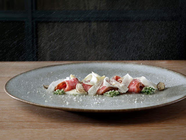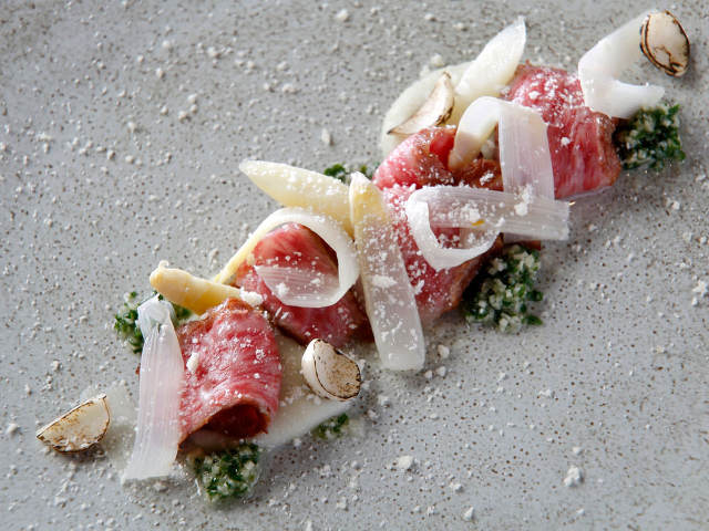 昆布の雨が降るメインディッシュ?! メインは「お肉料理 羅臼昆布水を纏った『特選黒毛和牛』 焼きホワイトアスパラと太白ごま油とわけぎのソース」(写真上)。九州産の黒毛和牛のロース肉の表面をバーナーで炙り、300℃のオーブンで一気に焼成。周りを焼き固めることでうまみを閉じ込め、なかをレアに仕上げてジューシーな味わいに。白野菜はホワイトアスパラガスのバター焼きと、新じゃがいものペースト、グリルしたゆり根を添える。わけぎの風味が香るオイルソースは、脂分の多い和牛と合わせることで、口の中をさっぱりさせる効果も。