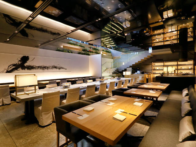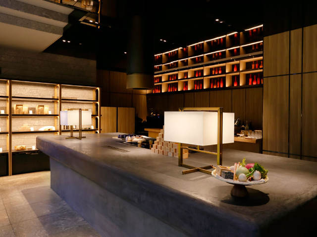 ホテル入口から入り、階段を降りると開放的な店内が広がる。店頭や階段には松の盆栽や苔のディスプレイを配置、日本らしさを感じられる。中央のダイニングテーブルは、漆喰塗りの特注品。周囲の白木のテーブルも、店内の雰囲気に合わせて特注で製作されたものだ。