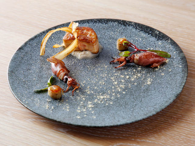 コースの前菜は4皿あり、3皿目には「参の前菜 蛍烏賊焦がしバターソース 新牛蒡のピューレとフォアグラ」(写真上)が登場。内臓まで味わう富山県産ホタルイカと、同じ内蔵のフォアグラを合わせ、宮城・山形県産新ごぼうの土の風味を添えた一品だ。ホタルイカはバターで香ばしく焼きあげ、昆布だしで炊いて砂糖でキャラメリゼした新ごぼうを添える。フォアグラの濃厚なうまみには、新ごぼうのピューレで複雑なうまみを表現する。