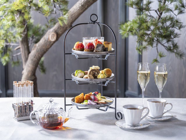 例えば、1日に1個しか産まない希少な卵「ネラの卵」を使ったクレームブリュレや、イチゴのわらび餅など、旬の素材を使ったデザートから、セイボリーの段にはいなりずしや自家製のお漬物などの軽食も盛り合わせる。