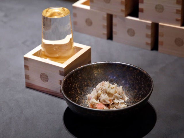 見どころは、提供時にお客の前で羅臼昆布から抽出した「昆布水」を全体に吹きかけるパフォーマンス。ふわりと舞う昆布の雨が見た目にも楽しませてくれるほか、香りによる刺激で食欲を刺激する。