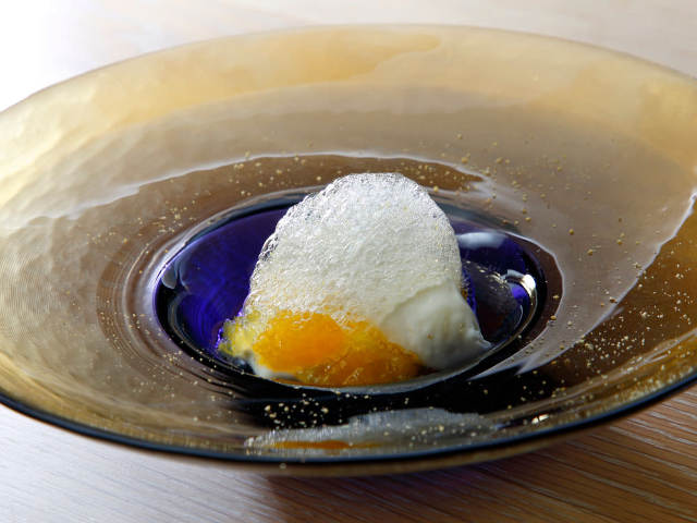 最後は「甘味 デコポンジュレ・シャルトリューズソルベ マスカルポーネのムース・オレンジの泡」(写真上)。炭酸ガスを注入したマスカルポーネのムース、九州産デコポンのジュレ、デコポンアイス、そしてデコポン果汁で作った泡を順番に重ねた一品。器の周囲にはデコポンパウダーを振りかけ、風味を強める。デコポンの爽やかな味わいが特徴で、なんとも締めにふさわしい。