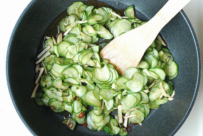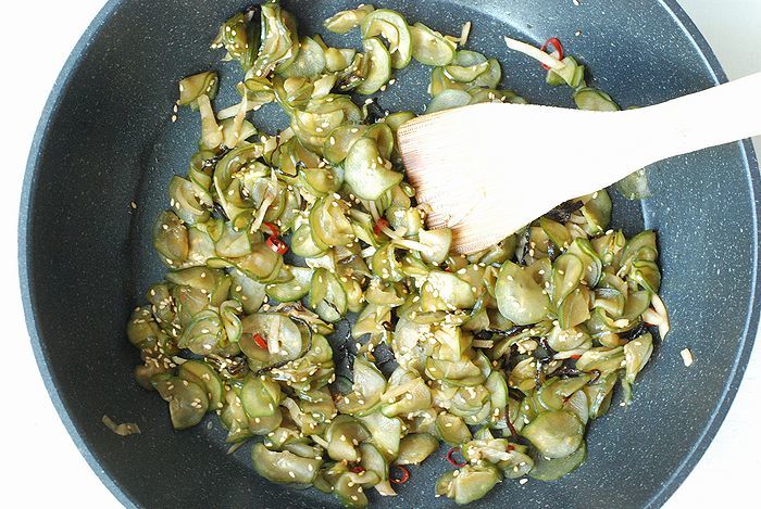 ③ フライパンに水気を絞ったきゅうりと◆を入れ、汁気がなくなるまで炒めます。