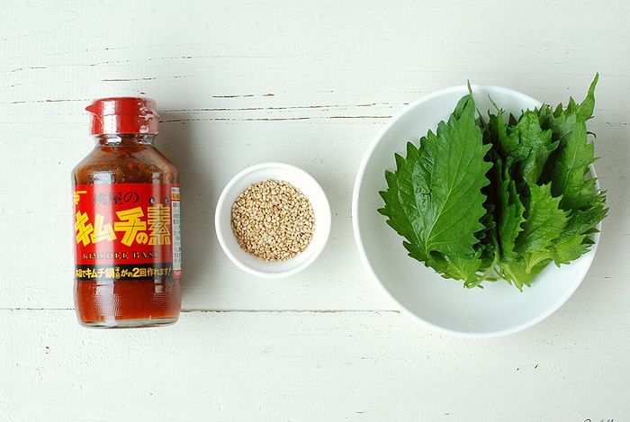 ① 大葉キムチだれを作ります。キムチの素、大葉、いり胡麻をミキサーにかけます。